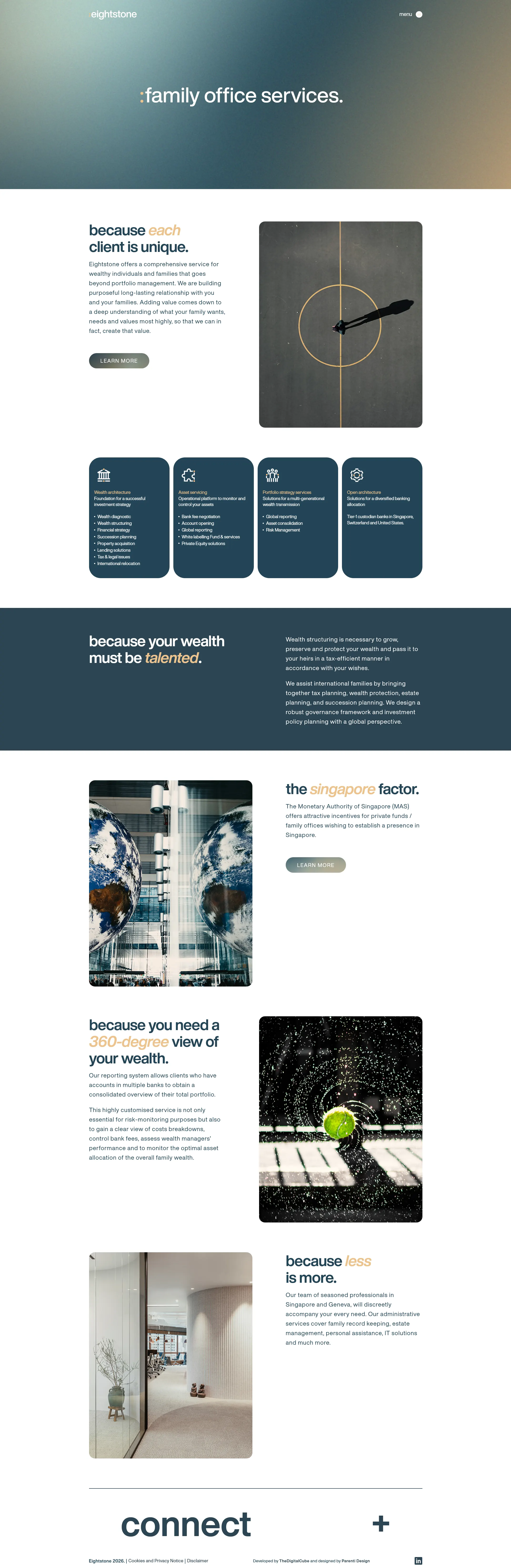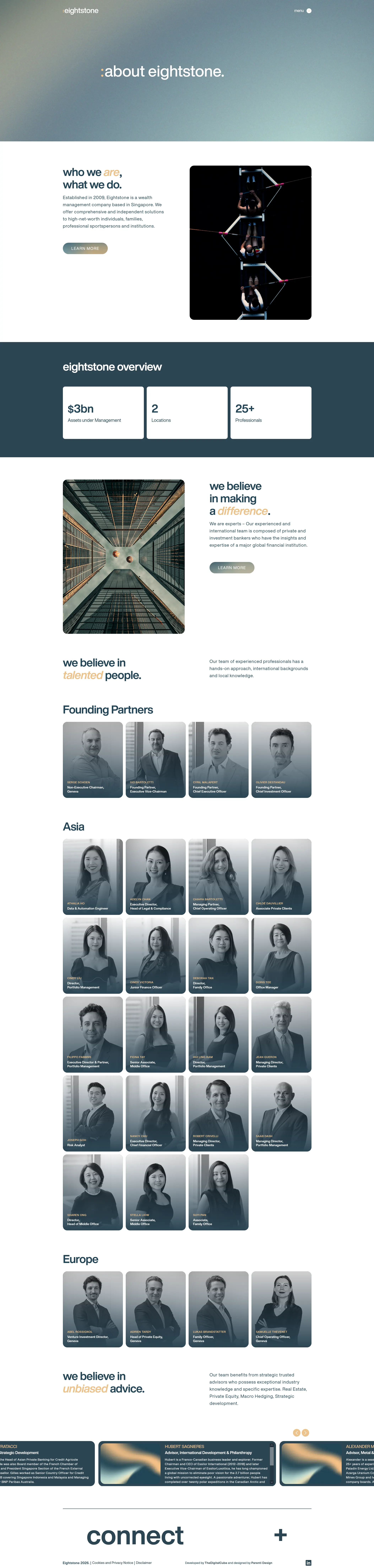 Eightstone is a multi-awards family office based in Singapore and Geneva. Building from a long business relationship, we were tasked to develop the third revamp of their website. Despite its apparent simplicity, this project presented several technical challenges such as background videos for the buttons or a layover menu with an animated unusual shape and featuring a background video as well. Videos being particularly bandwidth-heavy, we had to use the latest standards to facilitate page loading while keeping a reasonably high resolution for the assets.