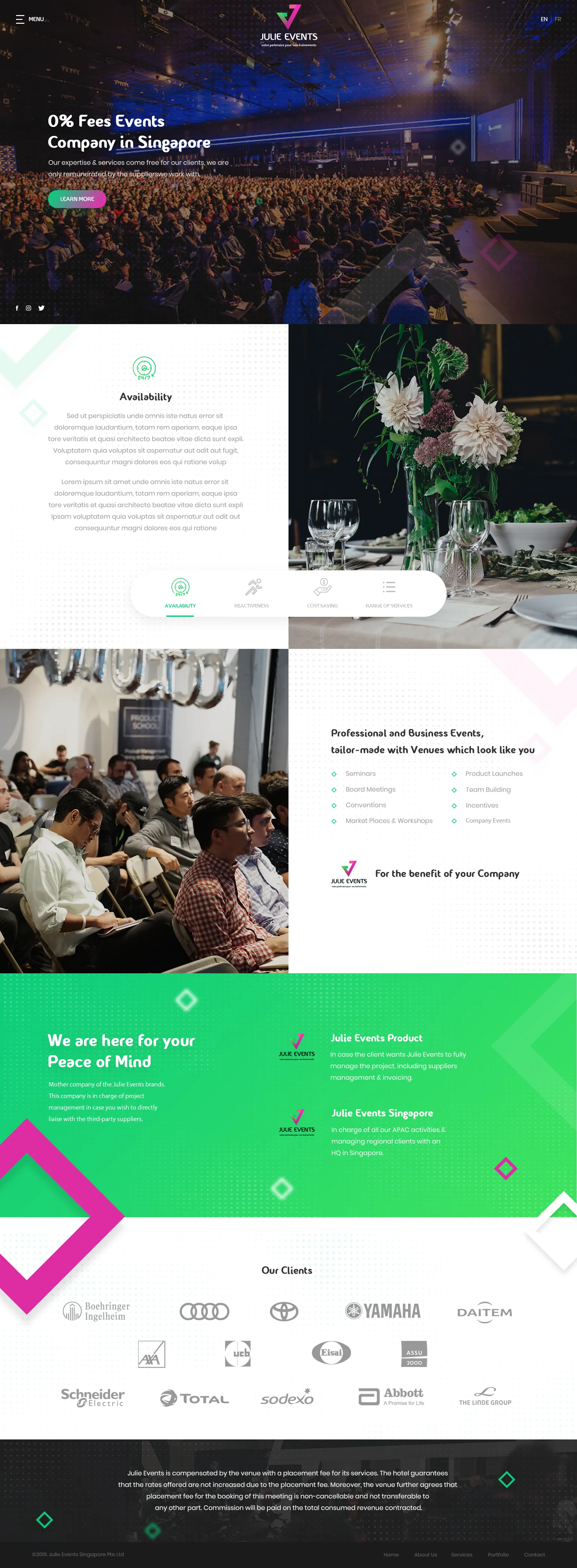 Julie Events is a French event management company with a strong APAC presence in Singapore. We designed their website using visual elements inspired by their logo, while integrating a robust SEO strategy from the earliest stages of the design process.