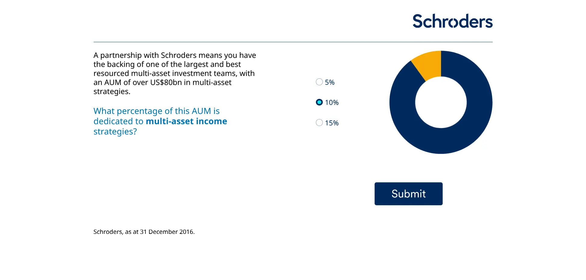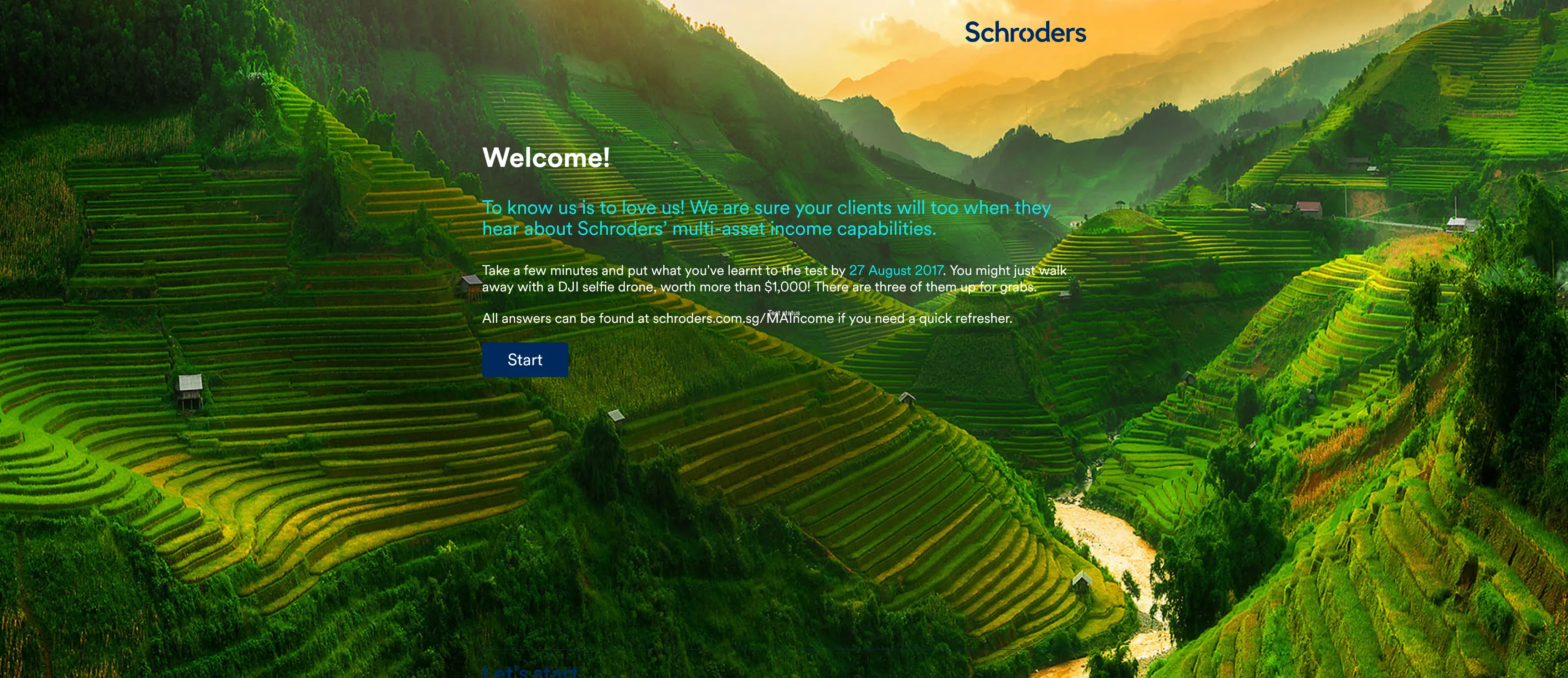 We developed this interactive questionnaire aimed at testing the clients knowledge in Schroders financial products. It includes lead saving, gamification through animations and is fully responsive.