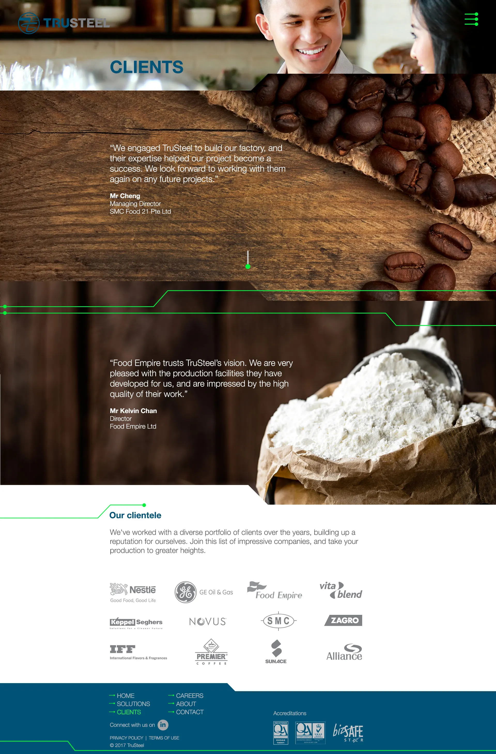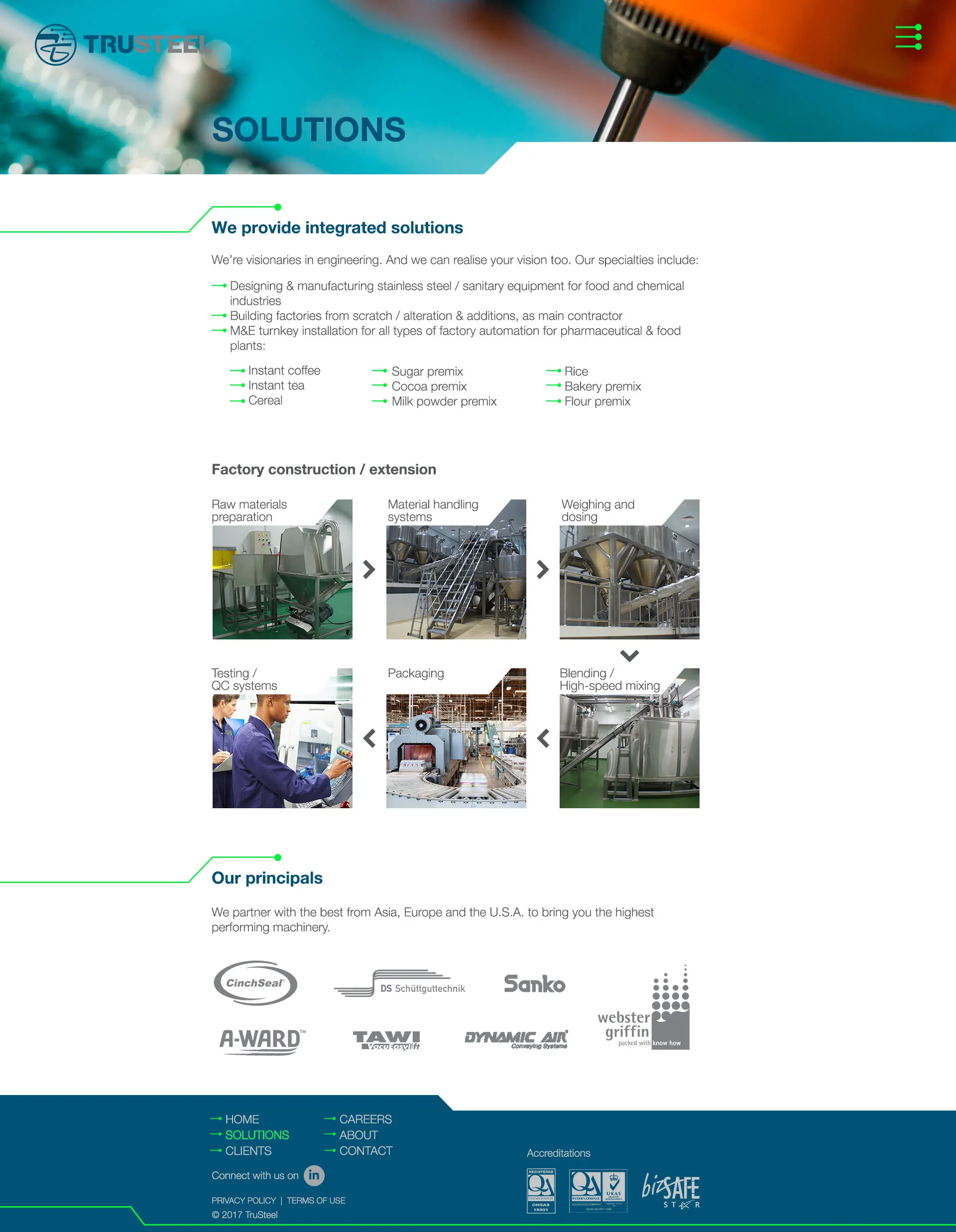 Trusteel is a engineering company for processing systems in the food and nutraceutical industries. Partnering with a design agency, we developed their new website to rejuvenate their brand images. The key specificities of this project were the cut superposed images that had to remain elegant for the responsive design as well as on-the-fly color swaps when hovering certain categories. The website was fully built on Wordpress with custom modules to easily manage its content.
